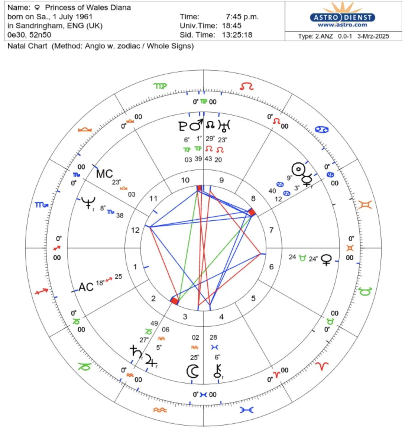 Through her chart, we see that Diana’s ability to remain both deeply human and remarkably royal was no accident. She blended the energies of compassion, strength, intellect, and beauty, creating a persona that was at once relatable and iconic. Her chart tells the story of a woman who was destined to be a beacon of love, and through her work, she solidified herself as the true “Queen of People’s Hearts.”